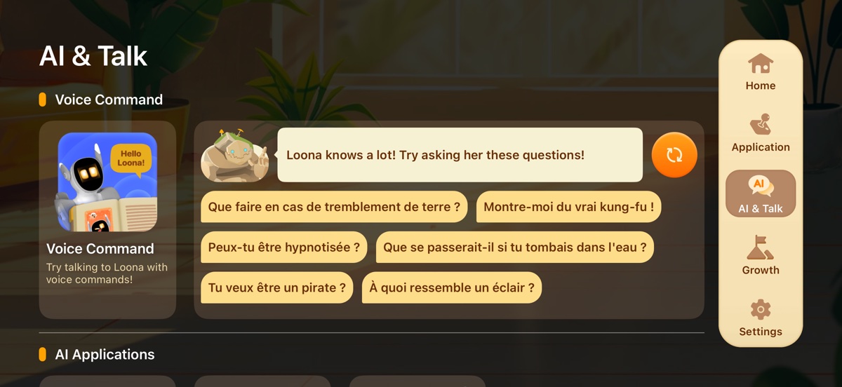 Loona répond à des questions, raconte des histoires ou échange sur des sujets simples, avec filtres parentaux intégrés pour éviter les sujets hors de propos.