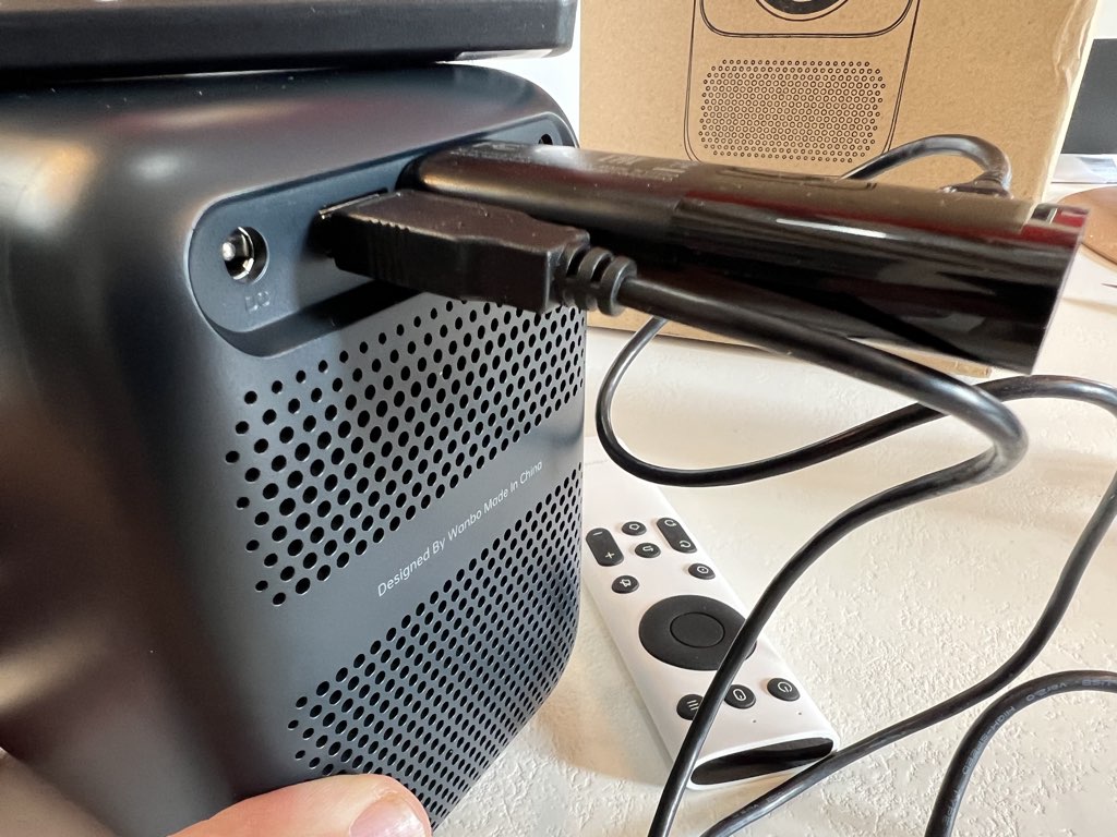 Le port USB du Wanbo T2 max new permet de lire des vidéos d’un disque ou d’une clé externe, mais il saura aussi alimenter suffisamment des sticks vidéo HDMI pour limiter les câbles.