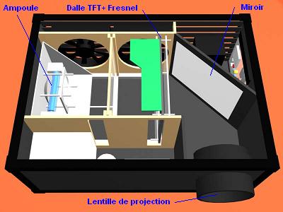 - Une dalle LCD translucide du type de celui d’une tablette traversé par cette lumière. Ici, pas de puces DLP avec des micro miroirs.