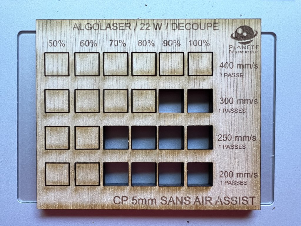 J’ai utilisé mon benchmark habituel sur contreplaqué 5 mm origine Bricoman pour comparer objectivement. Si ma Creality Falcon2 22 watts arrive à découper la matière à 400 mm/min en une seule passe, la Algolaser Alpha ne le peut qu’à 300 mm/min