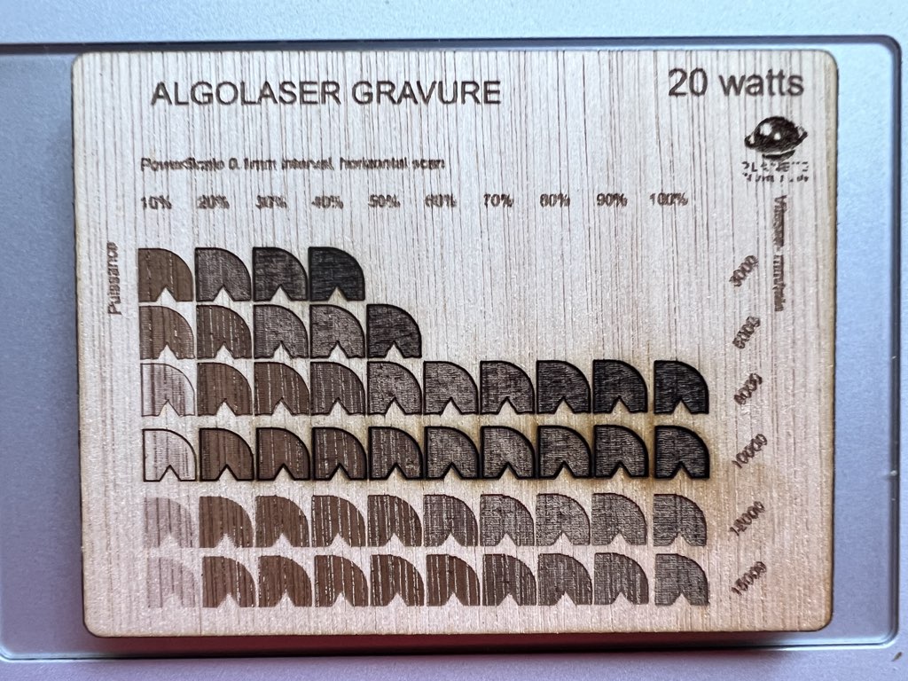 La Algolaser Alpha grave efficacement avec une homogénéité Quel que soit le niveau de gravure. Le constructeur annonce 22 watts, mais la comparaison avec ma Creality Falcon2 22 watts est à l’avantage de cette dernière. Je sais que le constructeur a changé la puissance réelle de sa tête de 20 à 22 watts. Il se peut que mon modèle soit toujours en 20 watts.