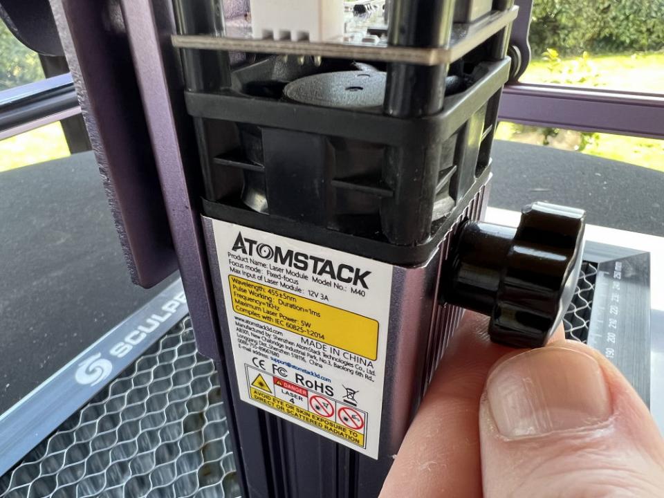Il faut faire coulisser la tête sur un rail puis bloquer via une grosse molette. C’est basique mais efficace. Atomstack fait évoluer ses têtes laser de modèle en modèle et c’est le cas de celle de la A5 PRO + qui est plus performante niveau précision grâce à des ajustements sur les lentilles internes.