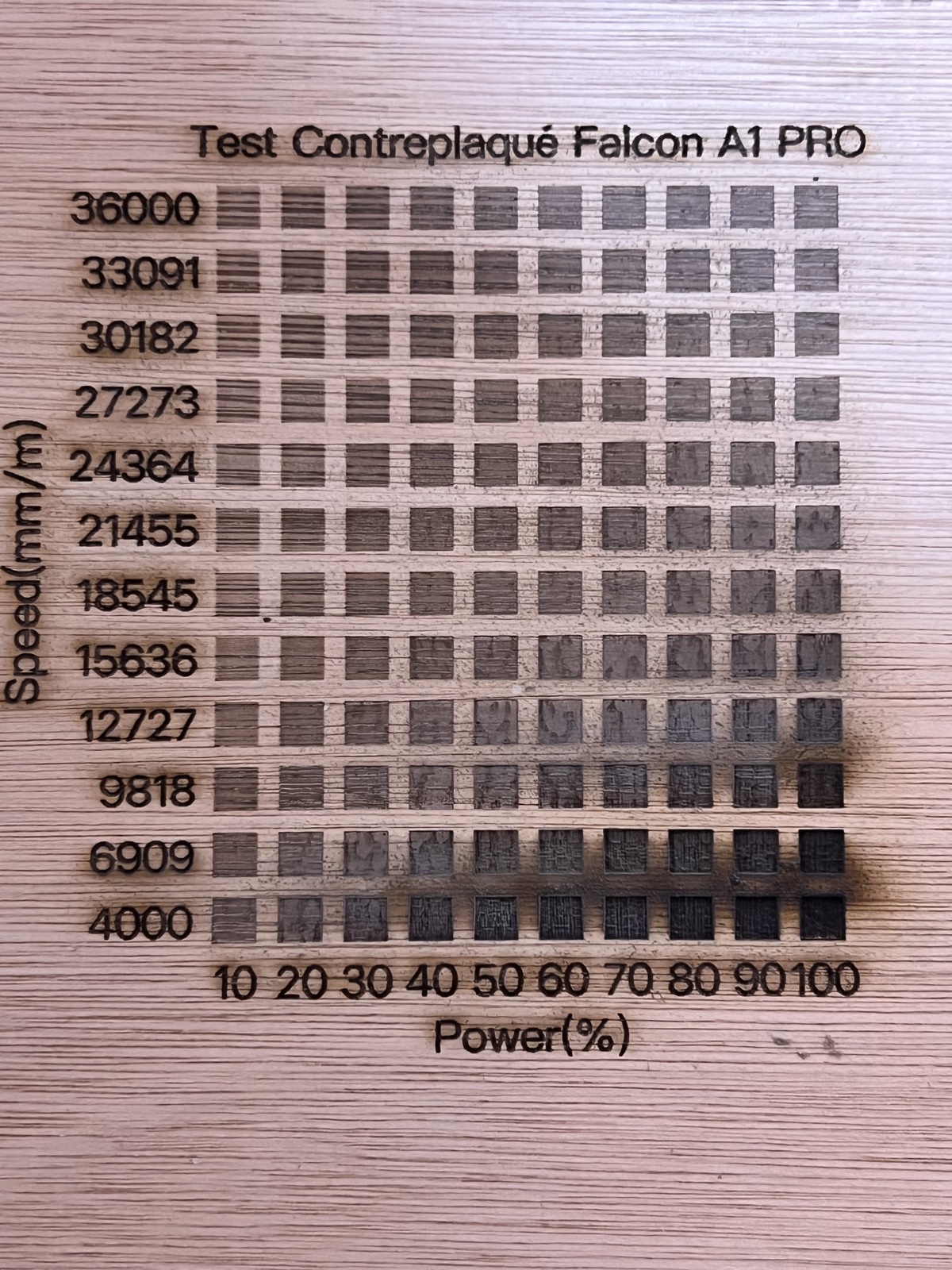 - La vitesse maximale de la Creality A1 PRO est de 36000 mm/minute §600 mm/s) et à cette vitesse à 100% de puissance, mon contreplaqué est marqué mais pas très profondément. Je recommande sur ce type de bois de se limiter à 12000 mm/min.