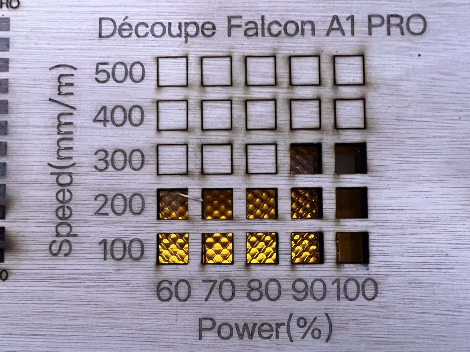 Avec la Creality Falcon A1 Pro, il est possible de découper du bois avec une vitesse correcte en une seule passe. Un contreplaqué de 5 mm se coupe ainsi à environ 300 mm/min (200mm/min pour pleine réussite), un rythme légèrement inférieur à celui de la génération précédente.