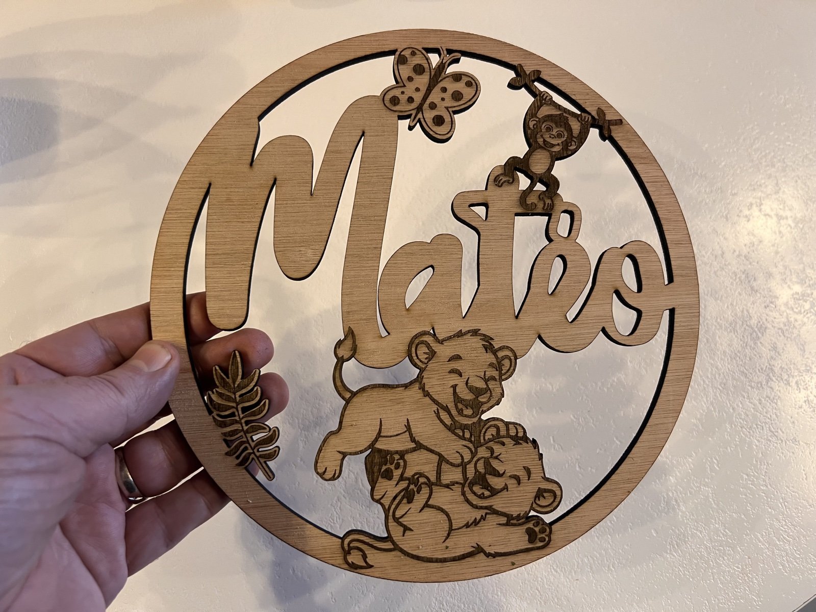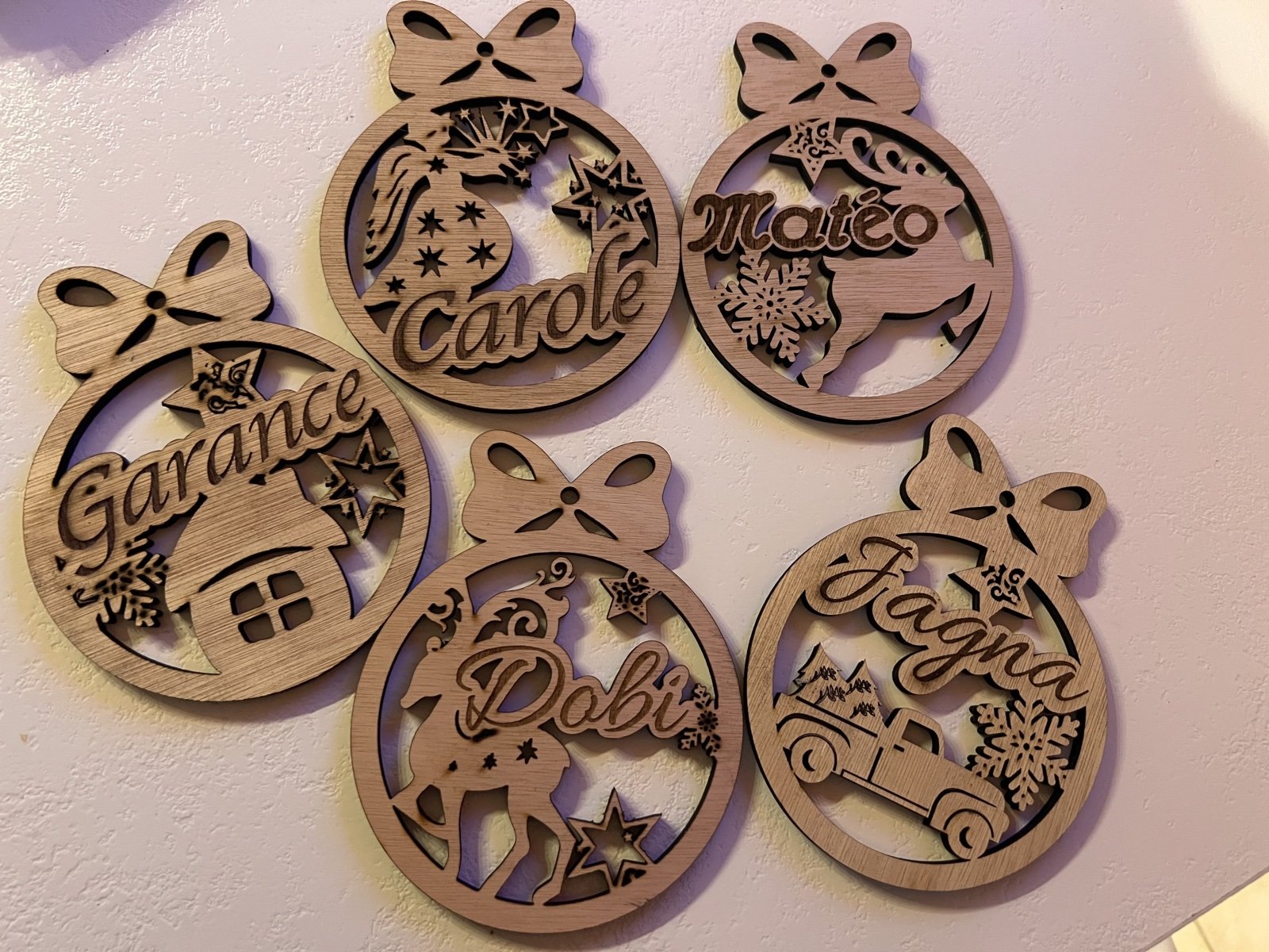 La puissance de 20 W reste adaptée pour travailler des bois courants et économiques comme le contreplaqué 5 mm. Plusieurs tests, dont des prénoms découpés et des décorations de Noël, ont été réalisés sans difficulté.