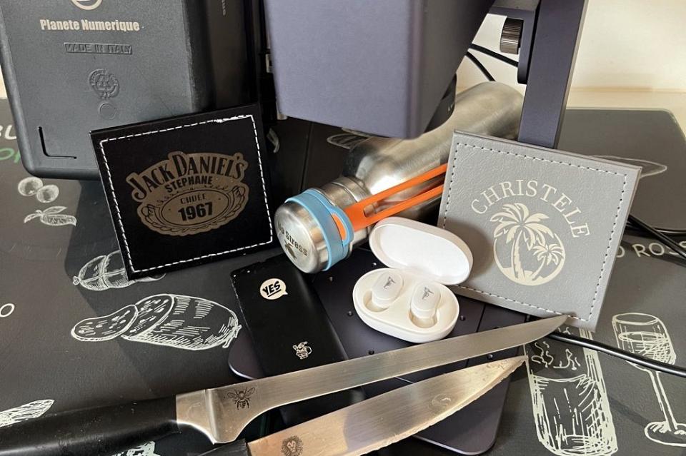 De mon côté, j’ai été étonné par la gravure des plastiques. Le résultat est superbe, que ce soit de l’ABS d’une télécommande, d’un chargeur de vélo, d’un chargeur, d’oreillettes, ou encore des sous de verre en cuir synthétique ou porte-clé.