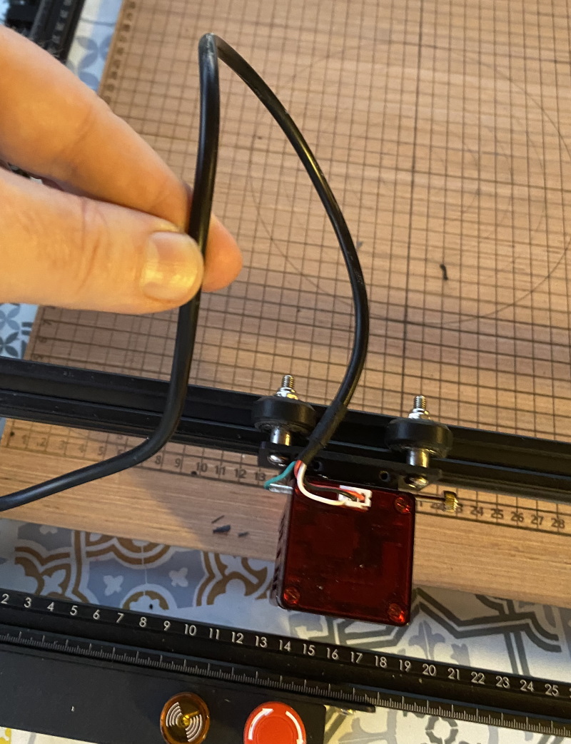 Il joue aussi le rôle de cale pour bien positionner le bloc laser en hauteur. Il n’y a qu’à légèrement le placer au-dessus de la matière à graver/découper. Ortur fourni aussi une cale de calibrage pour la hauteur parfaite que je n’utilise pas.