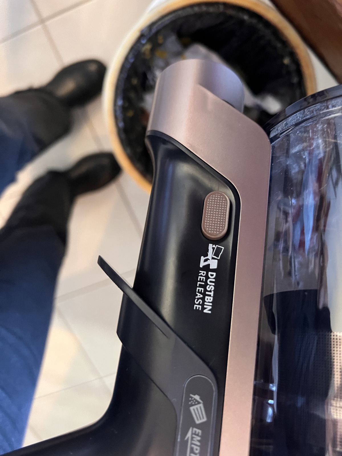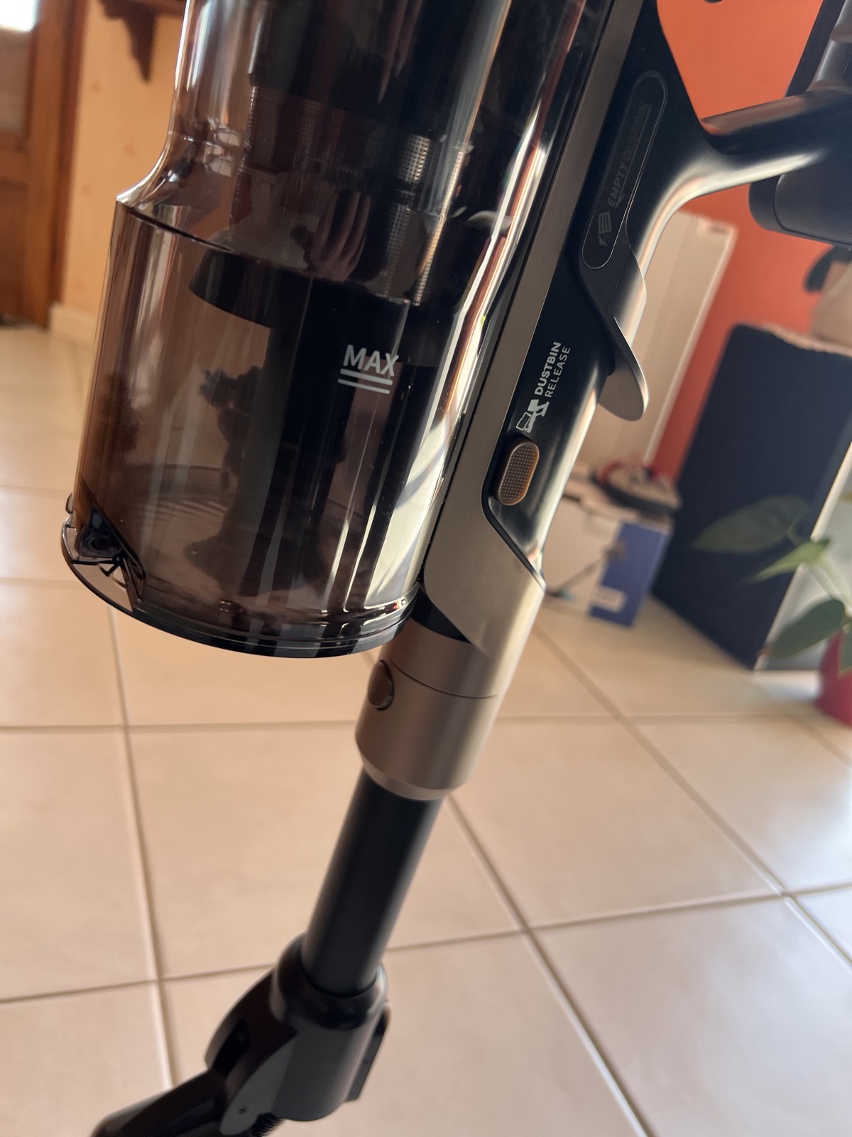 Le nettoyage des éléments de l’aspirateur n’est pas compliqué. Un bouton permet de décrocher le réservoir qu’il faut ensuite ouvrir au-dessus de sa poubelle. Le système de collecteur et filtres se démonte au besoin pour un nettoyage plus poussé. Le filtre HEPA est remplaçable (un second est fourni).