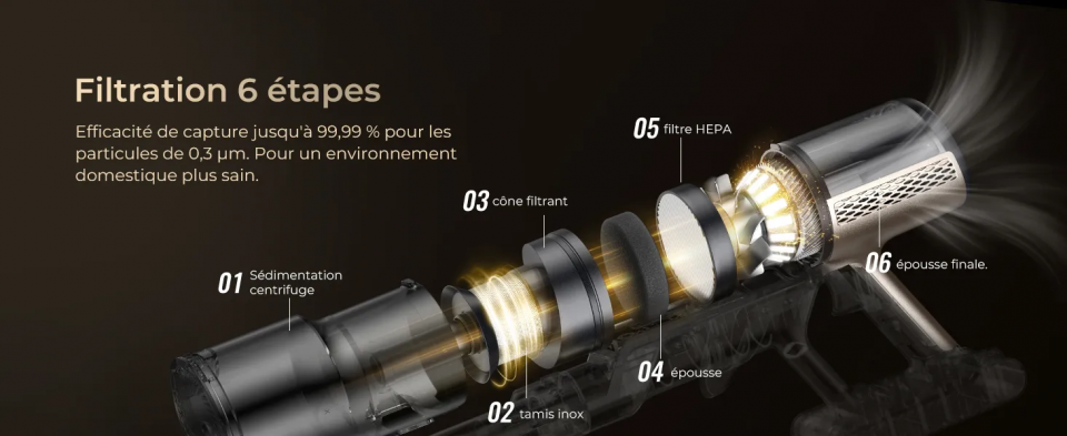 Le système de filtration propose six couches de filtration HEPA de manière à assainir l’air rejeté de quasi toutes les particules.