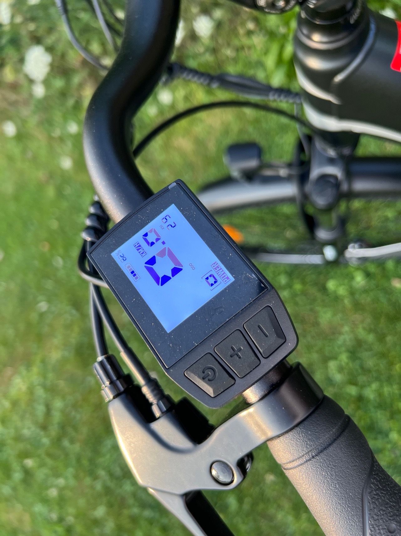 Le moteur 250 watts est situé dans la roue arrière avec le pilotage via un petit afficheur sur le guidon. Basique à première vue, il est bien complet et très lisible. Il donne accès aux informations habituelles, mode, vitesse, kilométrages, niveau batterie en barre et pourcentage et même consommation de batterie instantanée via un jeu de barre.