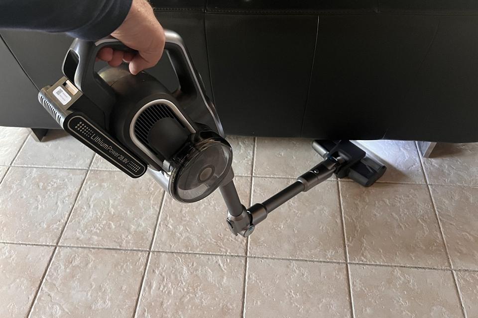 Le système de pliage est simple, via un simple bouton à presser situé sur sa face inférieure. Le tube métallique se plie jusqu’à un angle maximal de 90 degrés. Cette fonctionnalité est un point fort majeur de ce modèle. Elle permet d’accéder facilement et sans avoir à se baisser sous les meubles, les lits ou canapés. Même coudé, les brosses continuent à être alimentées.
