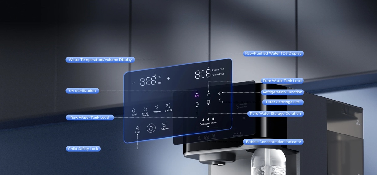 Le niveau de TDS, avant et après filtration, apparaît sur l’écran lors de la distribution.