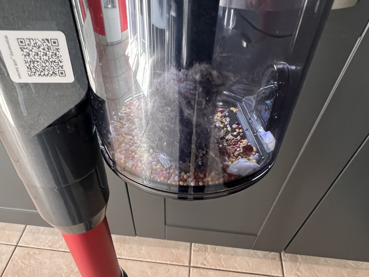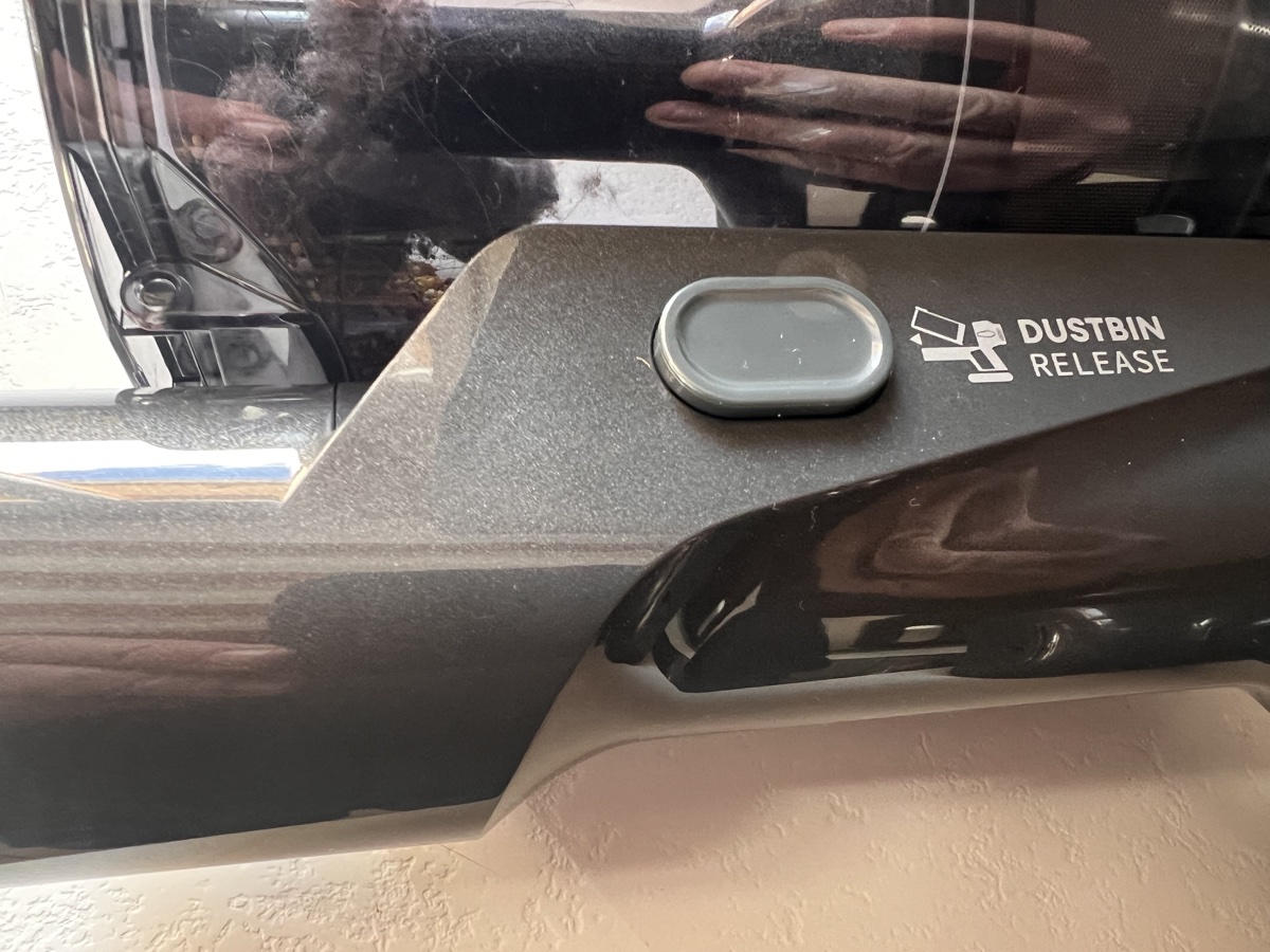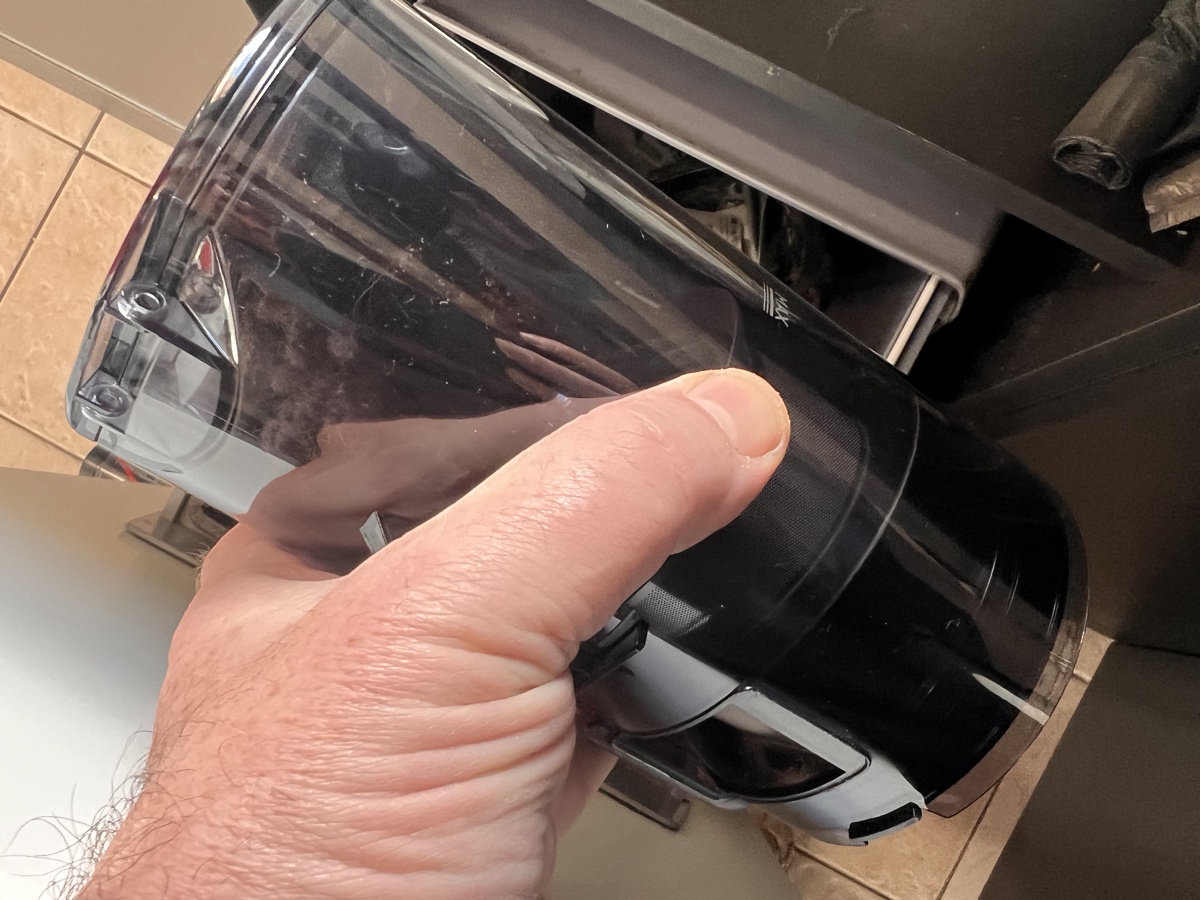 Pour vider le réservoir, le bloc cyclonique se décroche de l’aspirateur : ouvrez-le au-dessus d’une poubelle. Attention à ne pas le tenir à l’envers, sinon les débris risquent de sortir par le filtre.